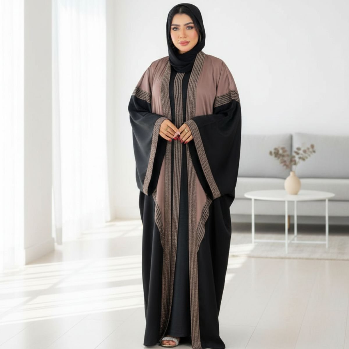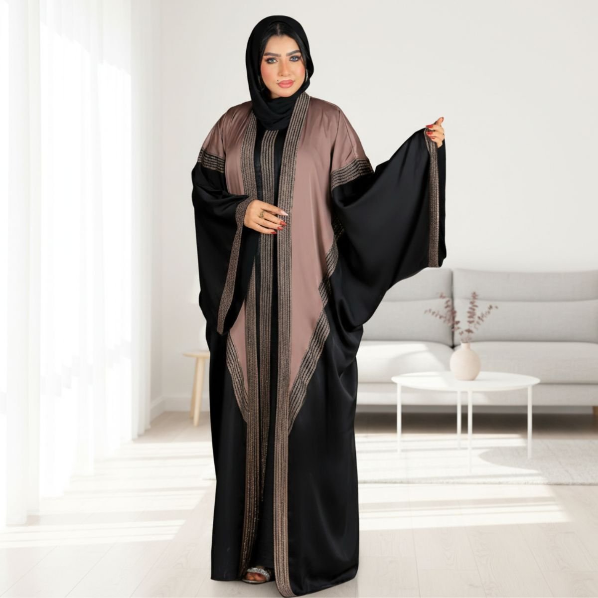 طقم مزدوج (2 في 1): العرض يشمل العباية الخارجية مع فستان داخلي (Robe) متناسق، لتستمتعي بإطلالة متكاملة بقطعة واحدة.