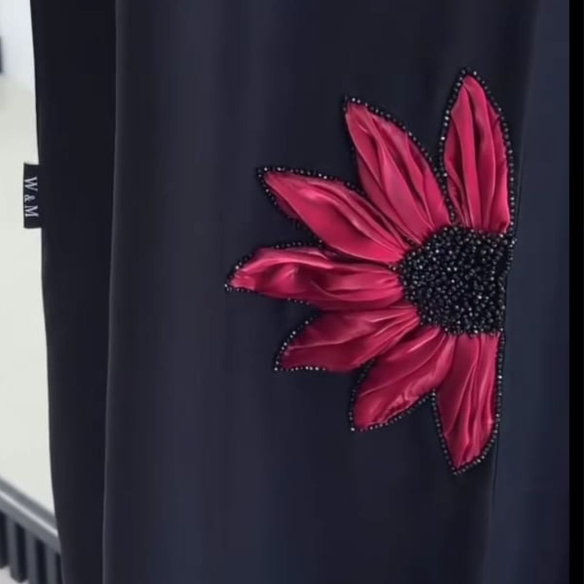 التفاصيل الفنية: تتميز العباية بتطريز يدوي فاخر على شكل زهور ثلاثية الأبعاد (3D) مصنوعة من قماش الساتان اللامع، محددة بخرز أسود دقيق يضفي بريقاً خافتاً وفخامة لا تضاهى.