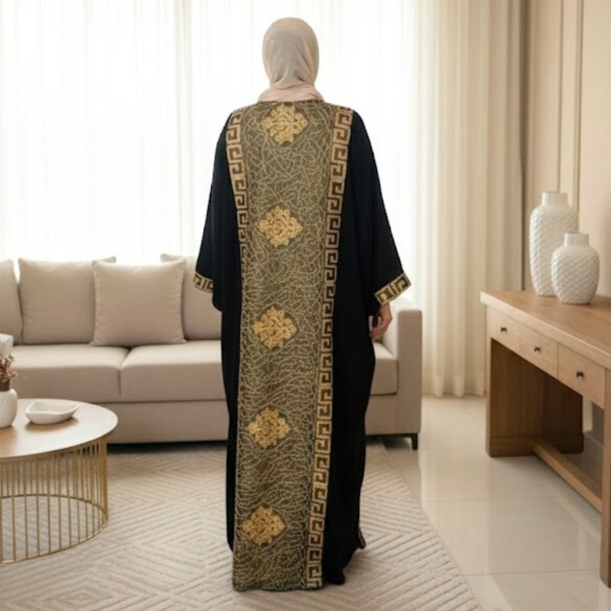 اللمسات الأمامية: تأتي بياقة وأطراف أمامية مطرزة بالكامل بنقوش هندسية ذهبية تبرز جمال التصميم وفخامته عند الارتداء.