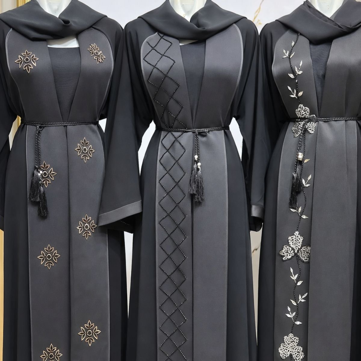 • تصاميم تطريز حصرية: يمكنك الاختيار بين التطريز النباتي الفضي، النمط الهندسي الراقي، أو الزخارف الذهبية الكلاسيكية.